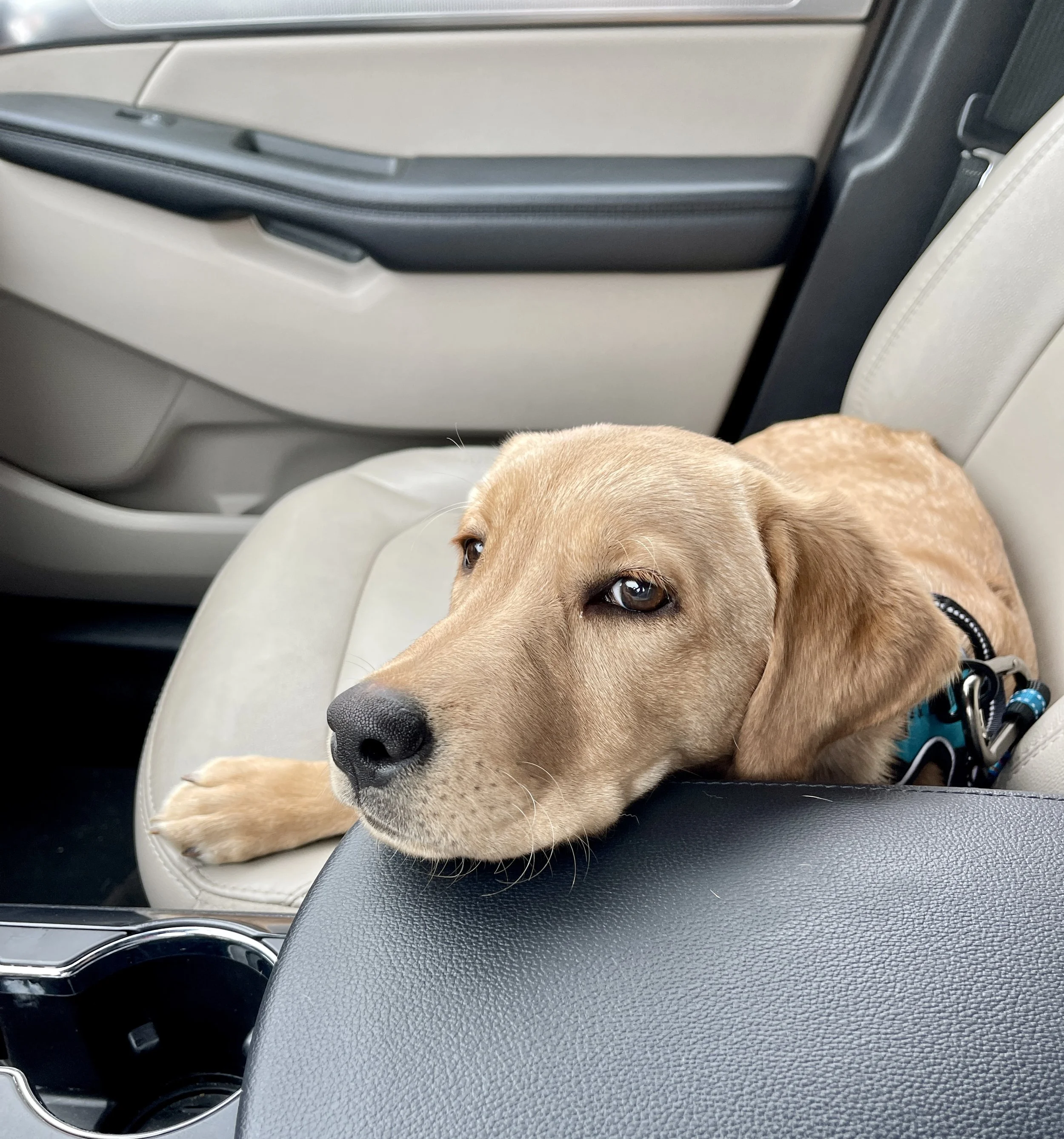 My goal each week is to introduce her to a new place and new people. Along with continuing to build on what we have already learned. She graduated from a crate in the car to a seat belt. Ideally, I ordinarily would have her in the back seat (much safer) but this first time I buckled her in next to me in the front. She stayed very calm and was a great passenger.